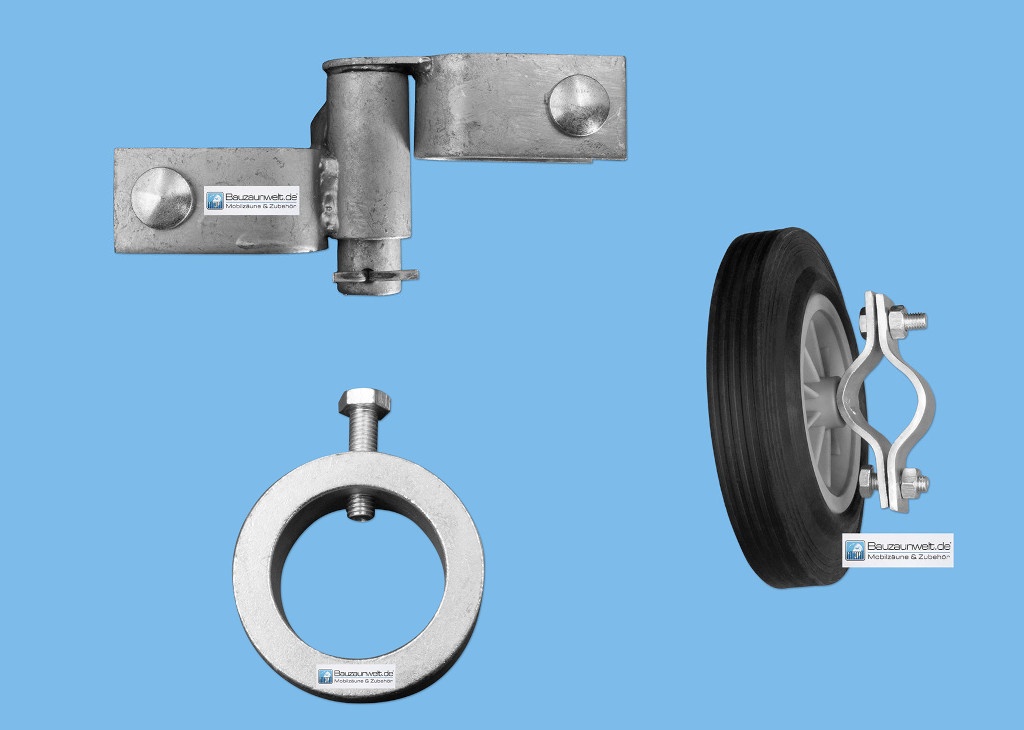 bestehend aus Drehgelenk, Laufrad Vollgummi & Drehtorlaufring - zum Erzeugen von 1 Torflügel aus Bauzäunen - das Drehgelenk als Scharnier anbringen und für die Beweglichkeit am Boden das Rad befestigen - Laufring als Schutz der Verzinkung des Zauns im Fuß