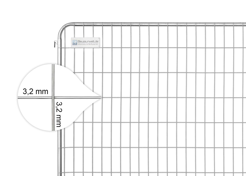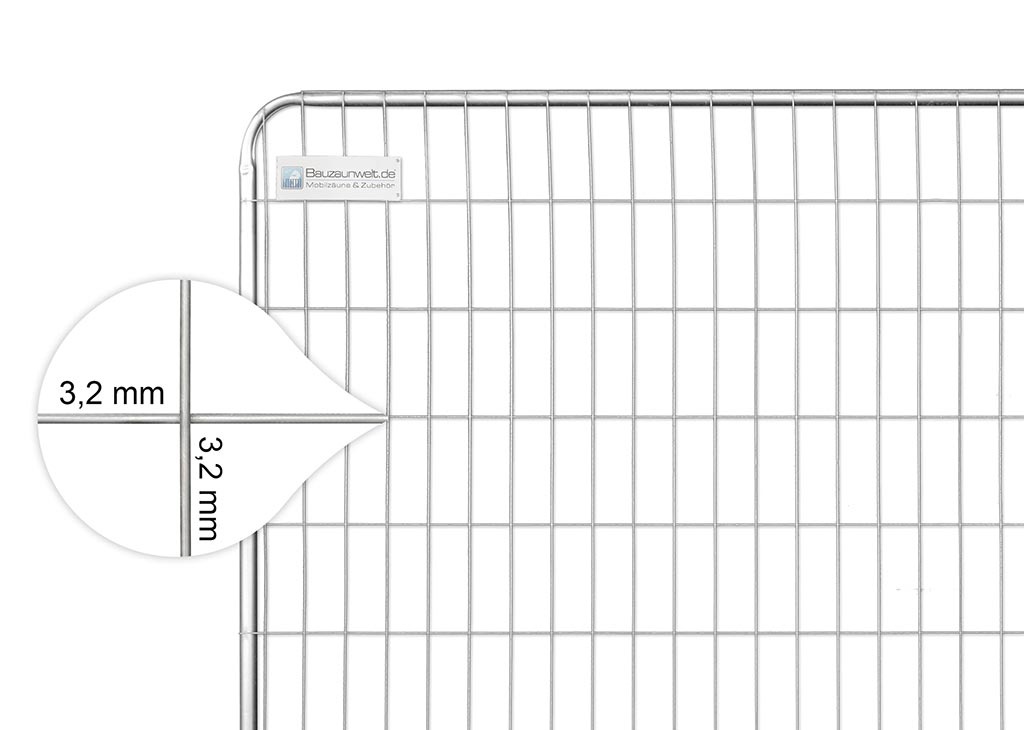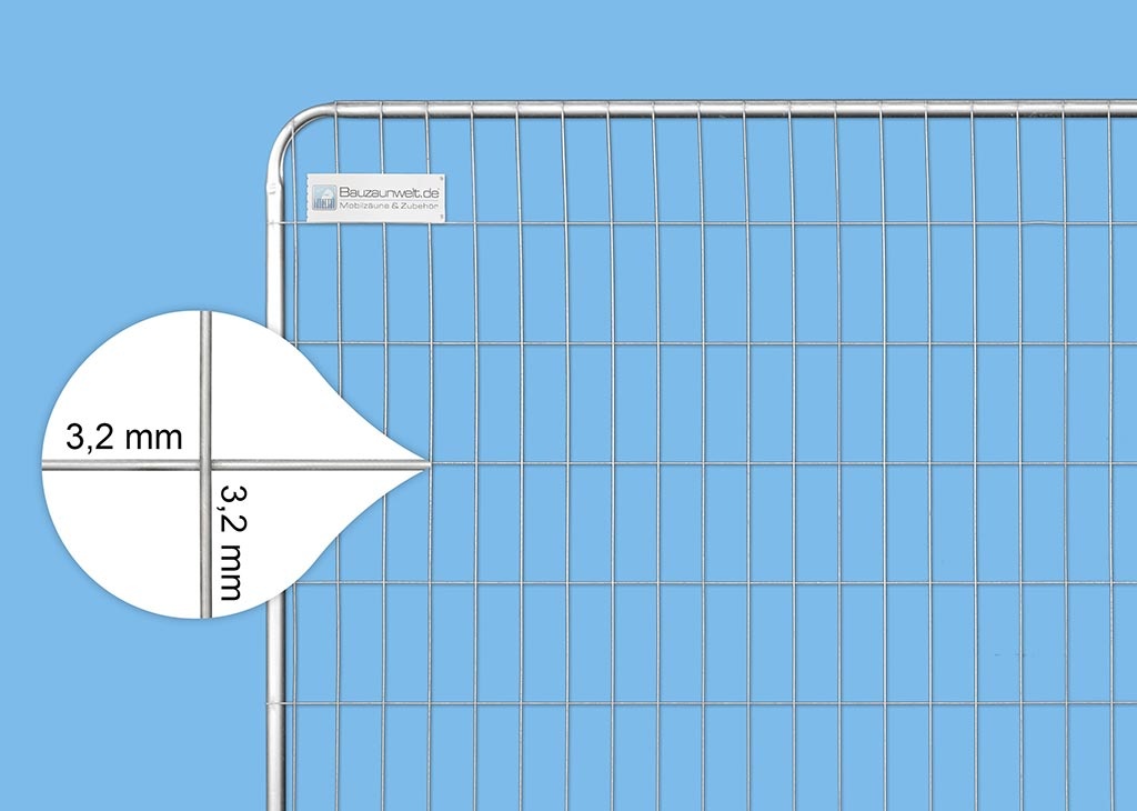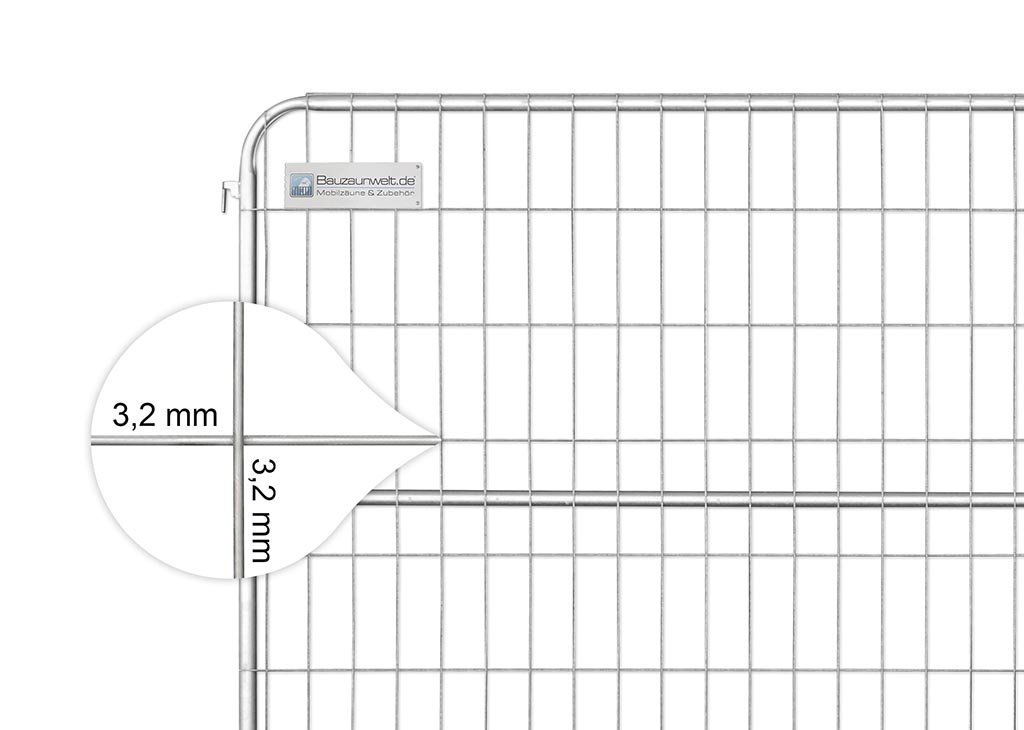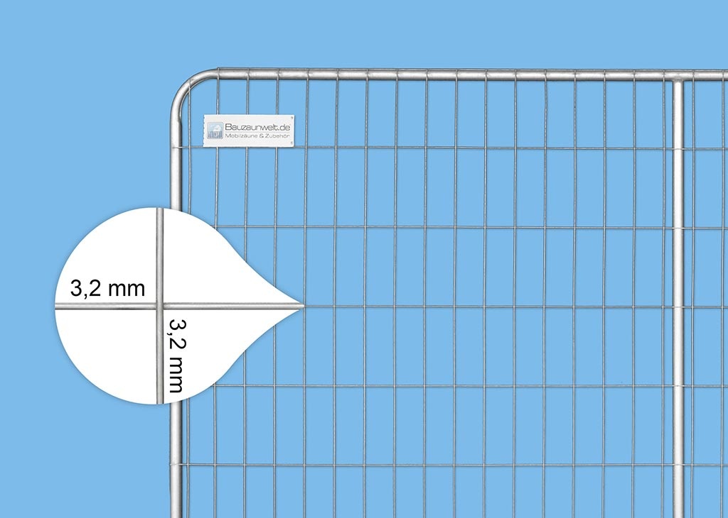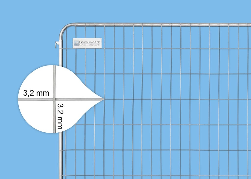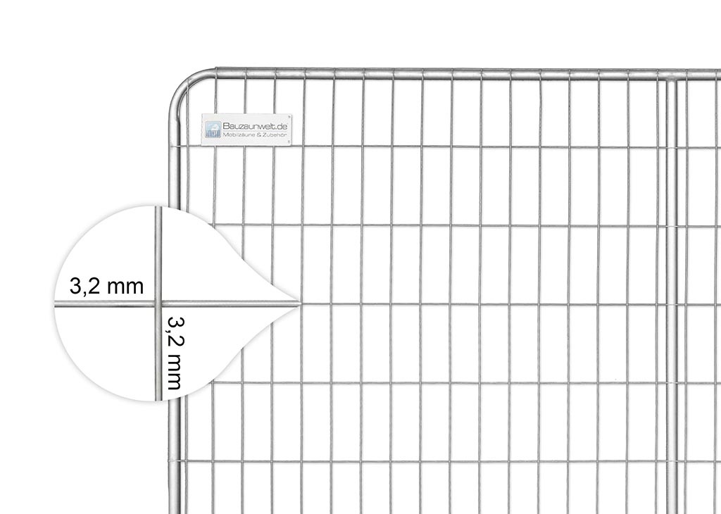 Im Vergleich zu herkömmlichen Bauzäunen haben sie eine wesentliche Verbesserung in der Haltbarkeit des Bauzaunrahmens durch die formbedingte Reduzierung der Schweißverbindungen, einer einheitlichen Drahtstärke von 3,2 mm und einer Rohrwandung von 1,2 mm, dazu kommt natürlich entsprechender Rost- und Korrosionsschutz durch die vorverzinkte Oberfläche.