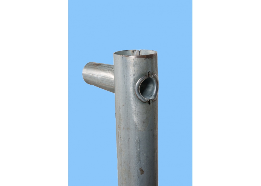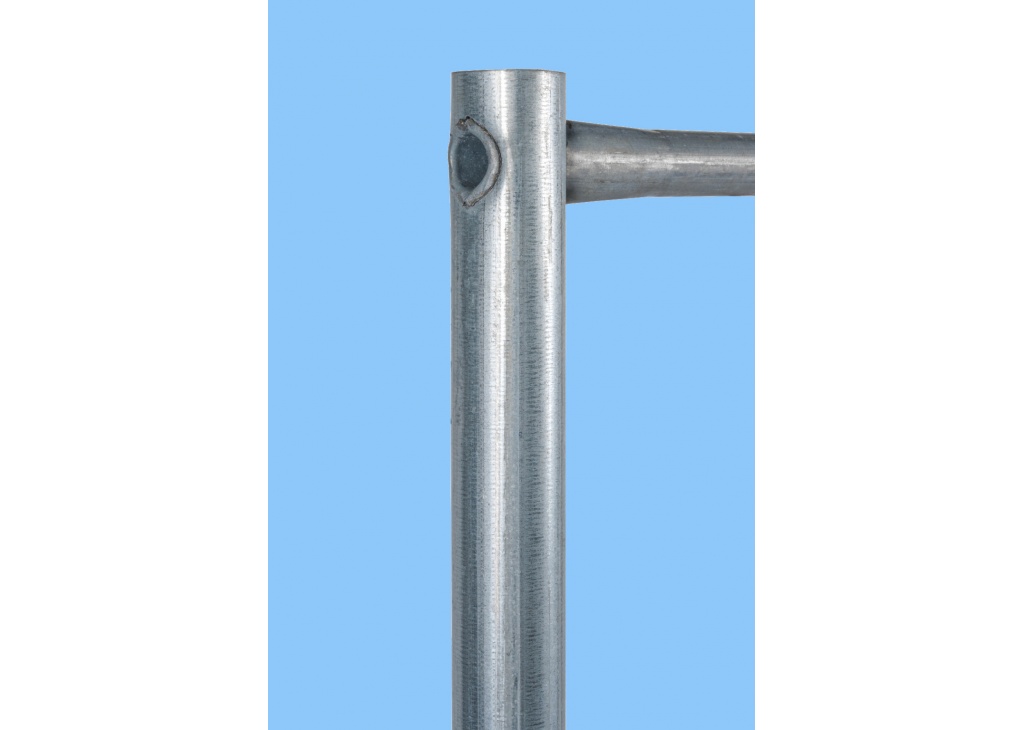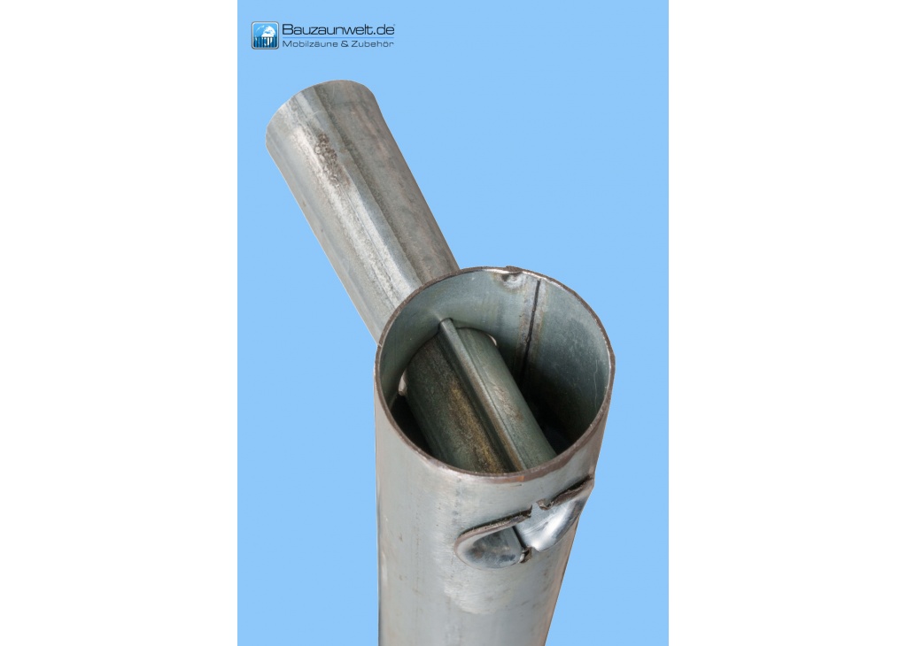 Wir nutzen hier einen Trick, damit der Bauzaun super stabil hält: Die Querrohre sind nicht nur eingeschoben, sondern fest mit dem Standrohr gebördelt. Dieses Rohr-in-Rohr-System sorgt dafür, dass sich die Bauteile selbst unter Belastung ohne Planen nicht lösen.